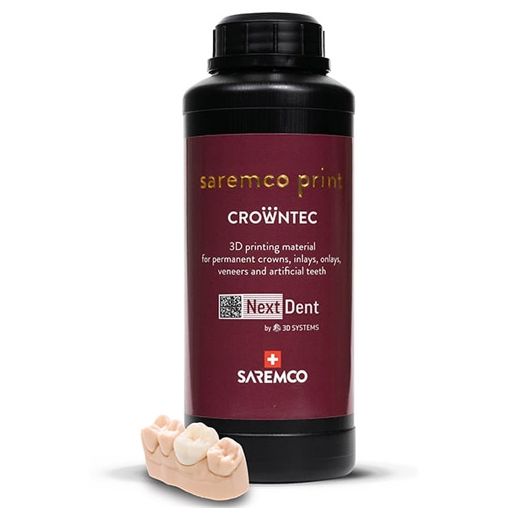 CROWNTEC is a premium composite resin that can be used to additively manufacture biocompatible permanent restorations including crowns, inlays, onlays, veneers, and artificial teeth for dentures. This FDA-cleared (510(k) clearance) and CE-marked Class IIa material offers best in class properties.