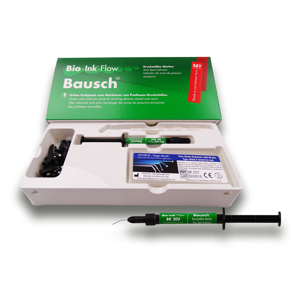 Bio-Ink®-Flow is a green, highly viscous, easy to apply paste for marking sore spots on the gum and locating them on the denture.