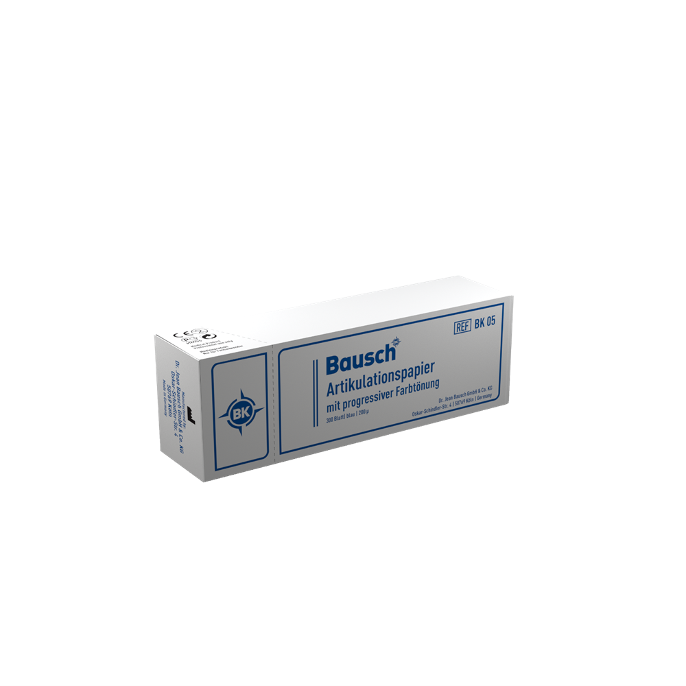 Bausch 200µ Articulating Paper with progressive color transfer can highlight any existing masticatory pressure interference clearly. Thinner test products which are available in thicknesses of up to 8µ (Arti-Fol®) should be used after adjusting and localizing the problem area.