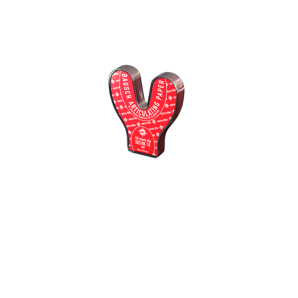 Bausch micro-thin Articulating Papers are especially suitable for the two-tone representation of static and dynamic occlusion. The first step is to inspect the static occlusion in red, and the second step to inspect the dynamic occlusion in blue. The color sequence can, of course, be altered.