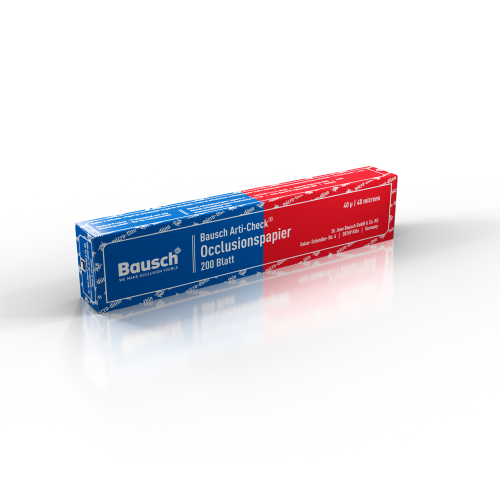 Bausch micro-thin Articulating Papers are especially suitable for the two-tone representation of static and dynamic occlusion. The first step is to inspect the static occlusion in red, and the second step to inspect the dynamic occlusion in blue. The color sequence can, of course, be altered.