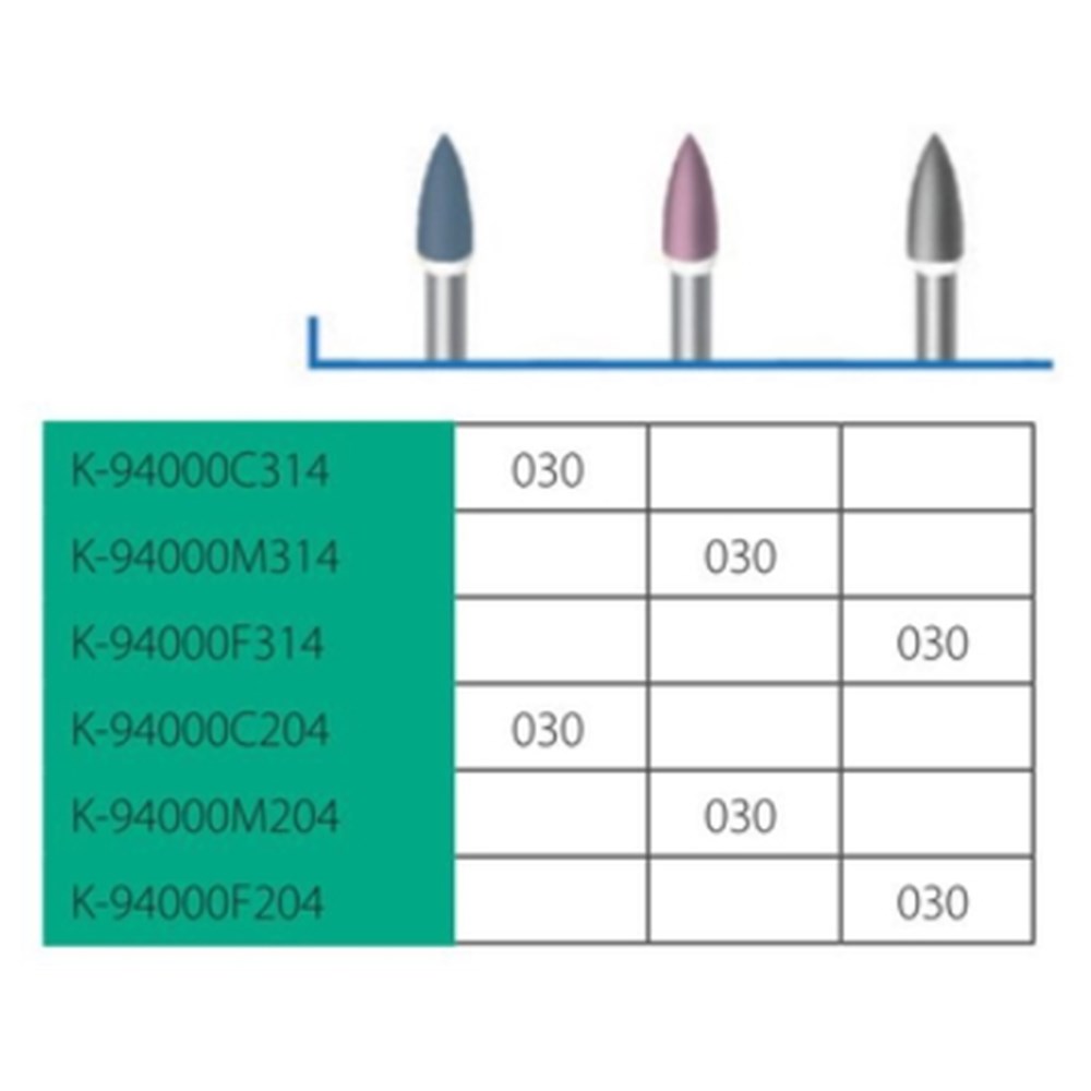 Polishers for ceramincs interspersed with diamond grit. Use with spray coolant. Slow speed shank 204, size 030 with 7mm working length