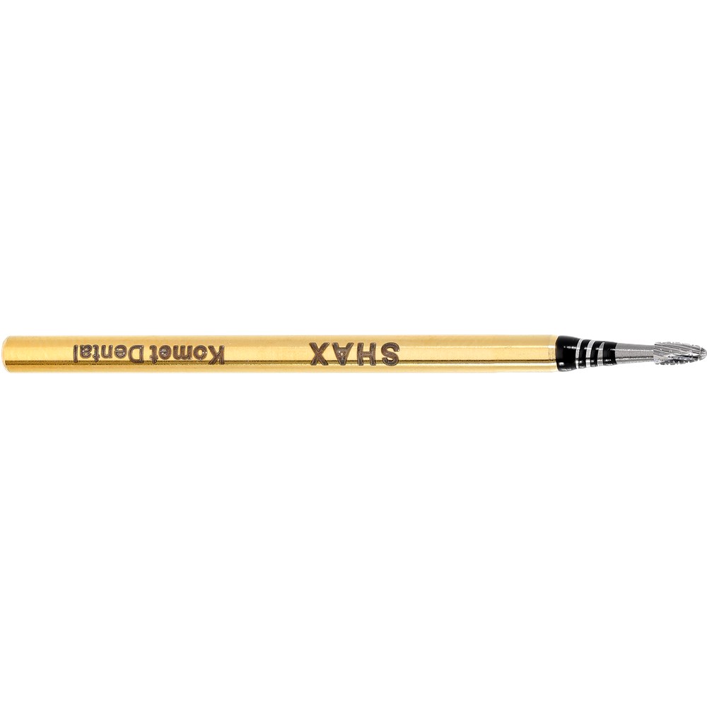 Shax are new generation of tungsten carbide cutters, for work on non-precious metals and model cast alloys. The active part is provided with a unique blade geometry where each tooth has its own individual height and depth. These cutters remove large amounts of material while creating a perfectly smooth finish on metal surfaces. H73SHAX, HP 104 shank for straight lab handpiece, size 014 (1.4mm) diameter with 3.1mm working length. For non-precious metal and model cast alloys.