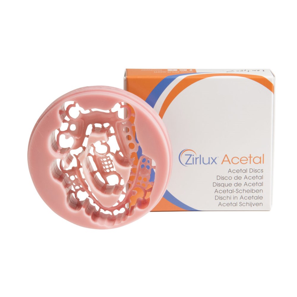 Zirlux Acetal is a semi-flexible, tooth colored material. It’s ideal for partial denture frameworks and other metal-free removable applications. This highly crystalline acetal copolymer possesses high tensile and flexural strength, fatigue resistance, low friction, low moisture absorption, and excellent dimensional stability.