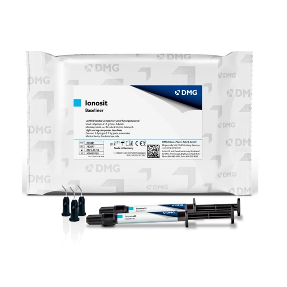 Ionosit Baseliner combines the optimum properties of glass ionomers and composites in one material. The material expands in a controlled manner by approx. 1%, and this expansion counteracts the polymerisation shrinkage stress of the composite used. The structural stresses in the entire cavity are released in this way, and microfractures in the composite are minimised. The Baseliner thus reliably ensures long-lasting and functionally reliable restorations.