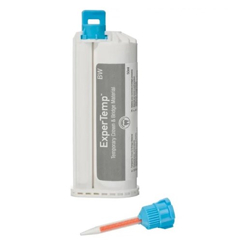 ExperTemp temporary crown and bridge material is a bis-acryl composite provisional material used to fabricate temporary crowns, bridges, inlays, and onlays as well as long-term temporaries. The 10:1 self-cured chemistry is easy to work with and provides exceptional strength, flexibility, and abrasion resistance. Superior performance combined with a natural esthetic make ExperTemp material the material of choice for temporization.
