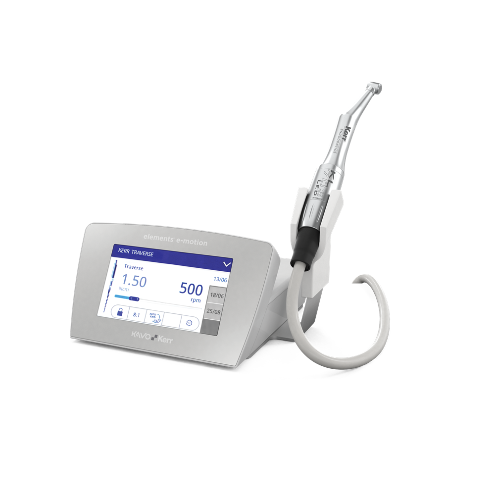 KaVo Kerr elements e-motion was completely designed and manufactured in Germany and has a stainless steel handpiece powered by KaVo. It is intuitive to use, due to a user-friendly, coloured touchscreen and an interface that allows 5 fully customisable presets with up to 10 file options each.
