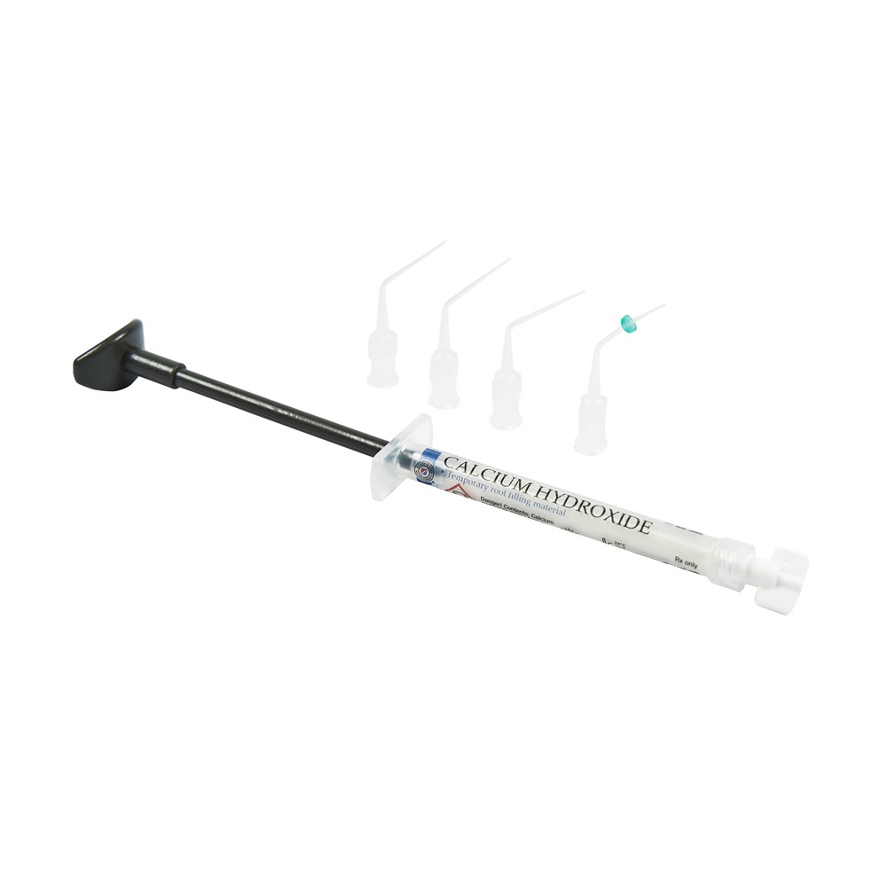 High-purity calcium hydroxide paste designed for temporary root canal filling and intracanal medicament applications. This formulation is suitable for use in cases of exudation, partial pulpotomy, apexification, and both internal and external root resorption. The product includes 20 application tips for precise delivery into the canal system.