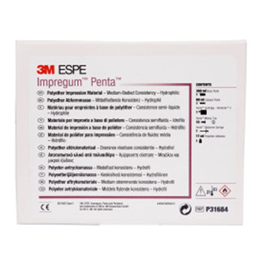 Introductory Kit includes: 1 Base Paste 300 ml, 1 Catalyst 60 ml, 1 Impregum Penta Cartridge, 10 Penta Mixing Tips Red, 1 Penta Elastomer Syringe, 1 Bottle Polyether Adhesive 17 ml