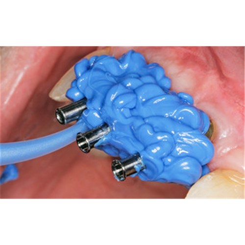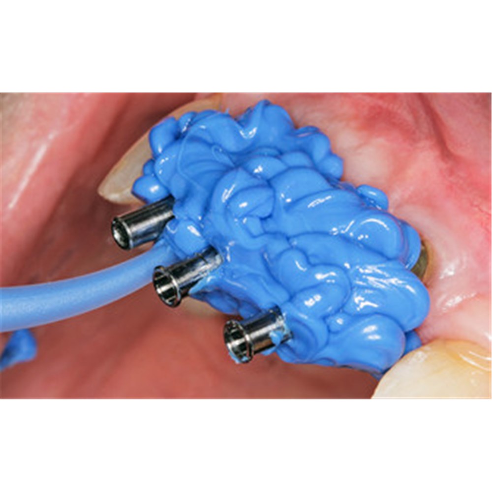 Honigum Pro Heavy is also ideally suited to taking implant impressions. Thanks to its unique structure, the material flows particularly well around the impression posts and transfer caps – but nevertheless reliably remains at the application site.