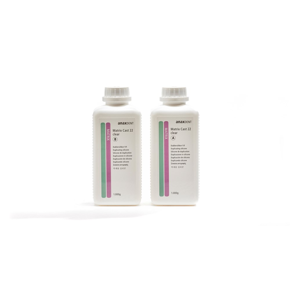 The transparency of the 1:1 silicone (Cast A + Cast B) prevents bubble formation when casting; therefore, light-curing materials can be processed safely. A Shore hardness of 21 makes it easy to divest models.