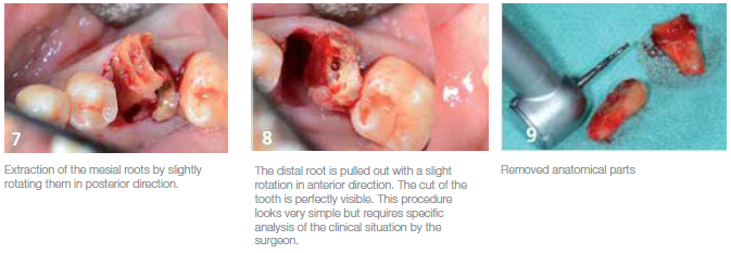 Use of the surgical bur to separate the mesial roots from the distal root. Very short treatment time to ensure preservation of the vestibular and lingual cortical bone. Depending on the clinical situation, a flap might be recommended as a visible opening to the root furcation.