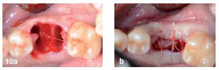 The alveolus and interradicular septum are preserved and a dental implant can be inserted under optimal conditions (if the extraction and immediate placement option is chosen). If placement is not immediate, sutures are used for controlled wound healing.