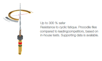Increased safety for the user and the patient Procodile Q files are clearly more resilient than other files on the market. They are up to 300 % more resistant to cyclic fatigue, compared to the files of other recipro- cating file systems. This significantly reduces the risk of file fracture.