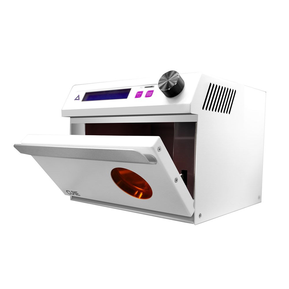 CURIE is a versatile UV chamber for 3D printing equipped with a sophisticated UV-light source management system that enables users to do more in less time and space. Produce consistent results thanks to preloaded curing times and easily add new material settings with its built-in SD Card reader. Ideal for dental professionals who take bio-compatibility seriously and care about patient safety.