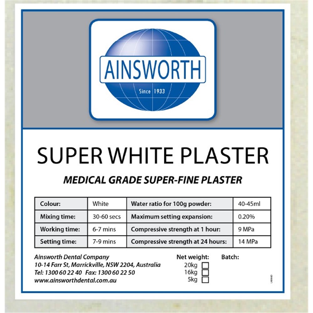 Ainsworth Super White Plaster is a medical grade superfine, extra white, stronger plaster for study models and orthodontic work.