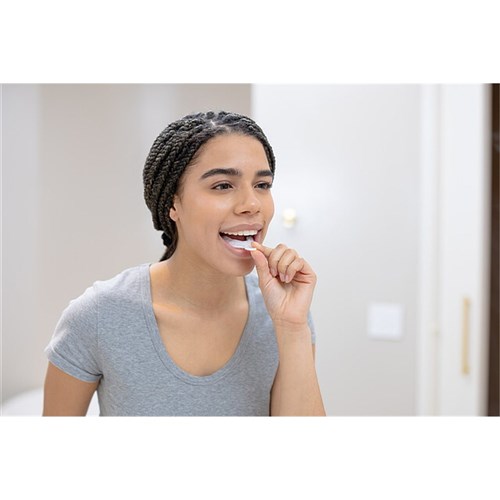 Thermoplastic occlusion trainer for condylar reposition after wearing protrusion splints during the night. The AM Aligner is heated and adapted to the patient's upper jaw by the clinician.