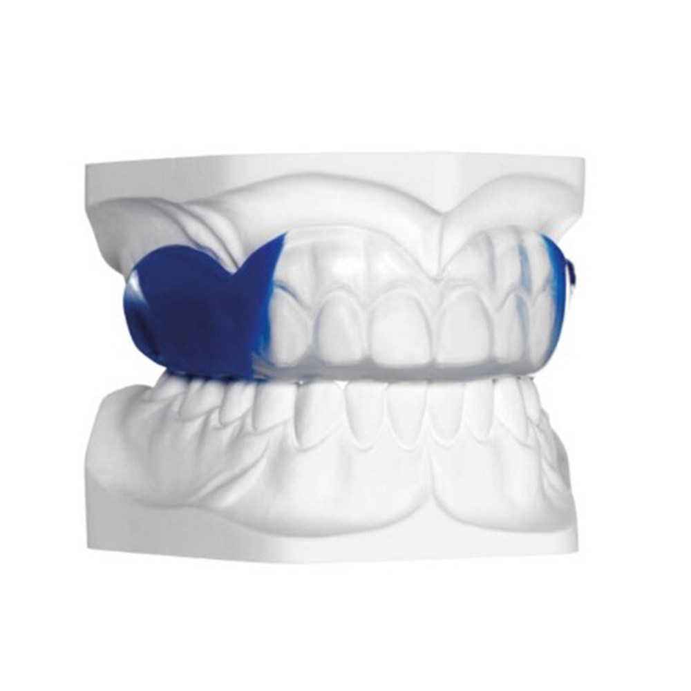 Two different degrees of hardness in one pressure moulding blank thanks to the integrated reinforcement in the delicate anterior region. Absorbs hard and flat impacts in contact sports. V-shaped harder insert (Shore A: 92) for variable size of front tooth protection.
