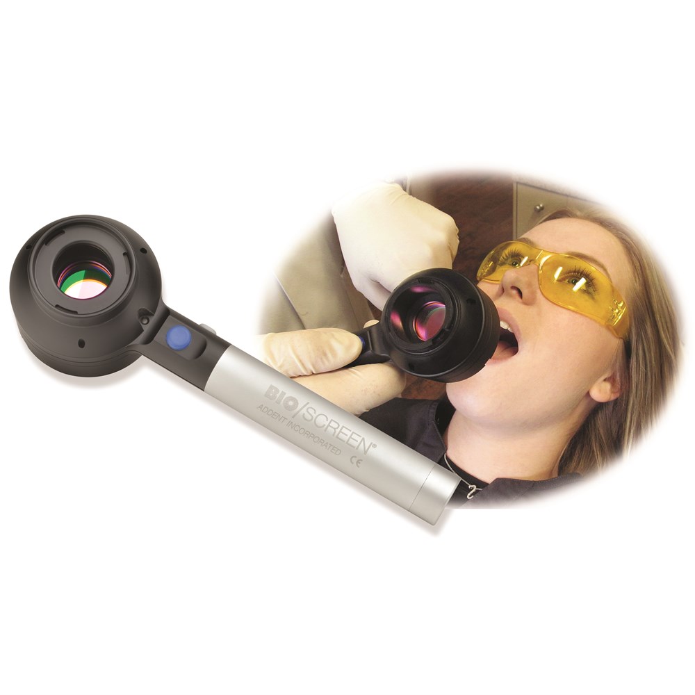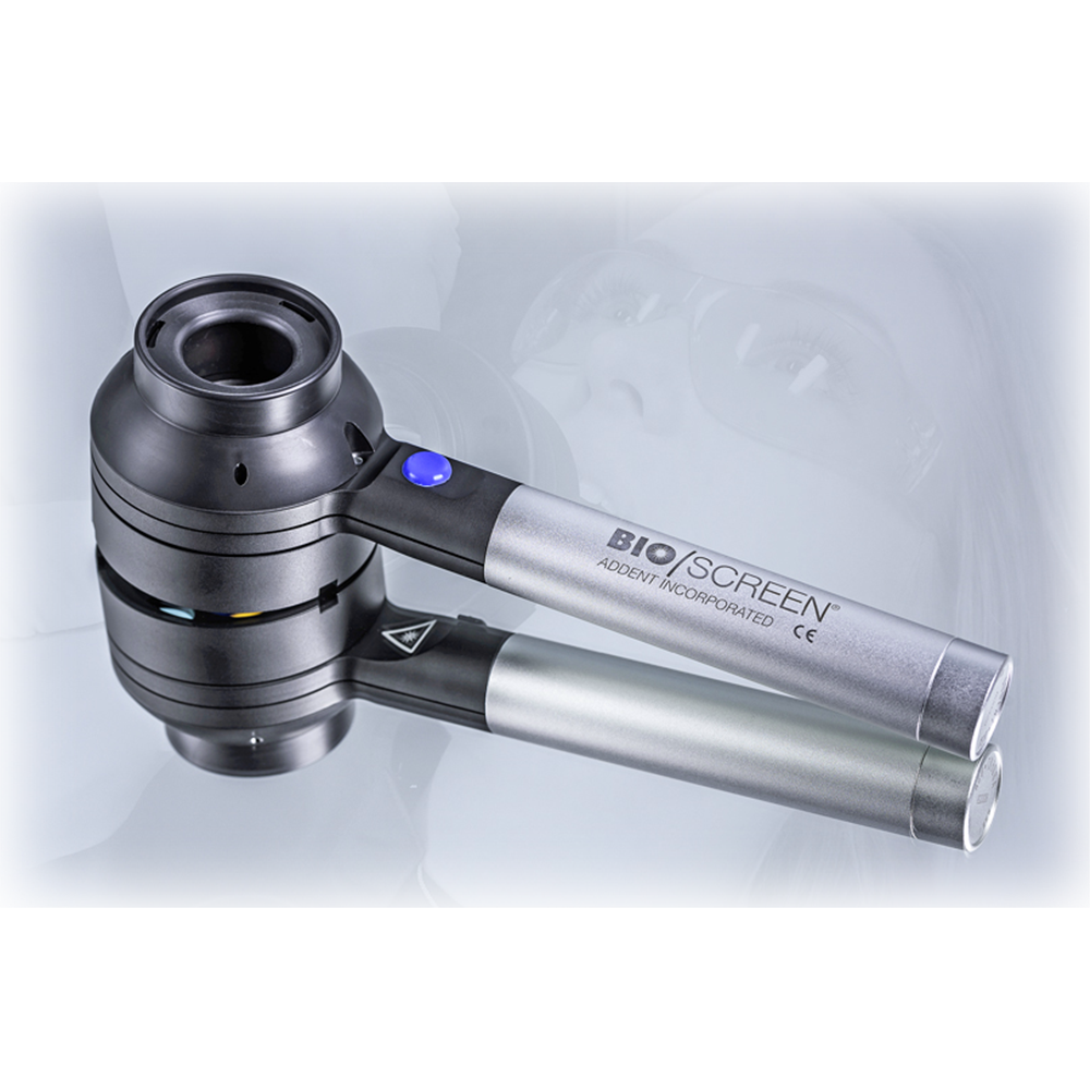 The Bio/Screen Oral Exam Light is a device intended for use as an adjunct to traditional oral examination to enhance the visualization of oral mucosal abnormalities. The Bio/Screen uses 5 powerful violet LEDs that shows biofluorescence in the oral cavity without turning off the room lights. It is powered by an internal rechargeable lithium ion battery. An on/off push button is located on the viewing side. An eyepiece and an optical viewing filter increases contrast between healthy and abnormal tissue. A battery charge indicator is located on the viewing side of the handle.