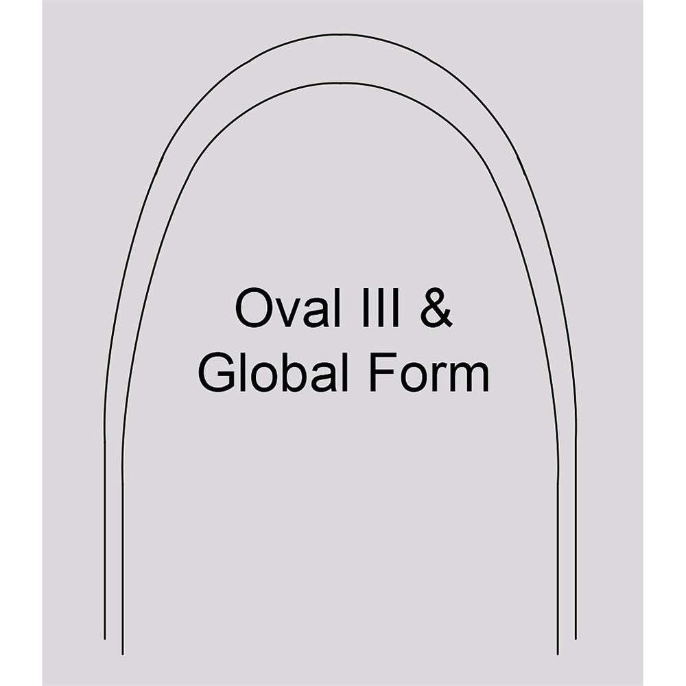 Oval III Arch Shape - slightly narrower arch form but with longer legs.Specifically designed for use with Straight Archwire Technique. Special alloy provides maximum spring while minimizing fracturing.  Excellent for all orthopaedic/orthodontic techniques.  Etched mid-lines - Upper 3 black laser marks; Lower 1 black laser mark.Pack of 10.