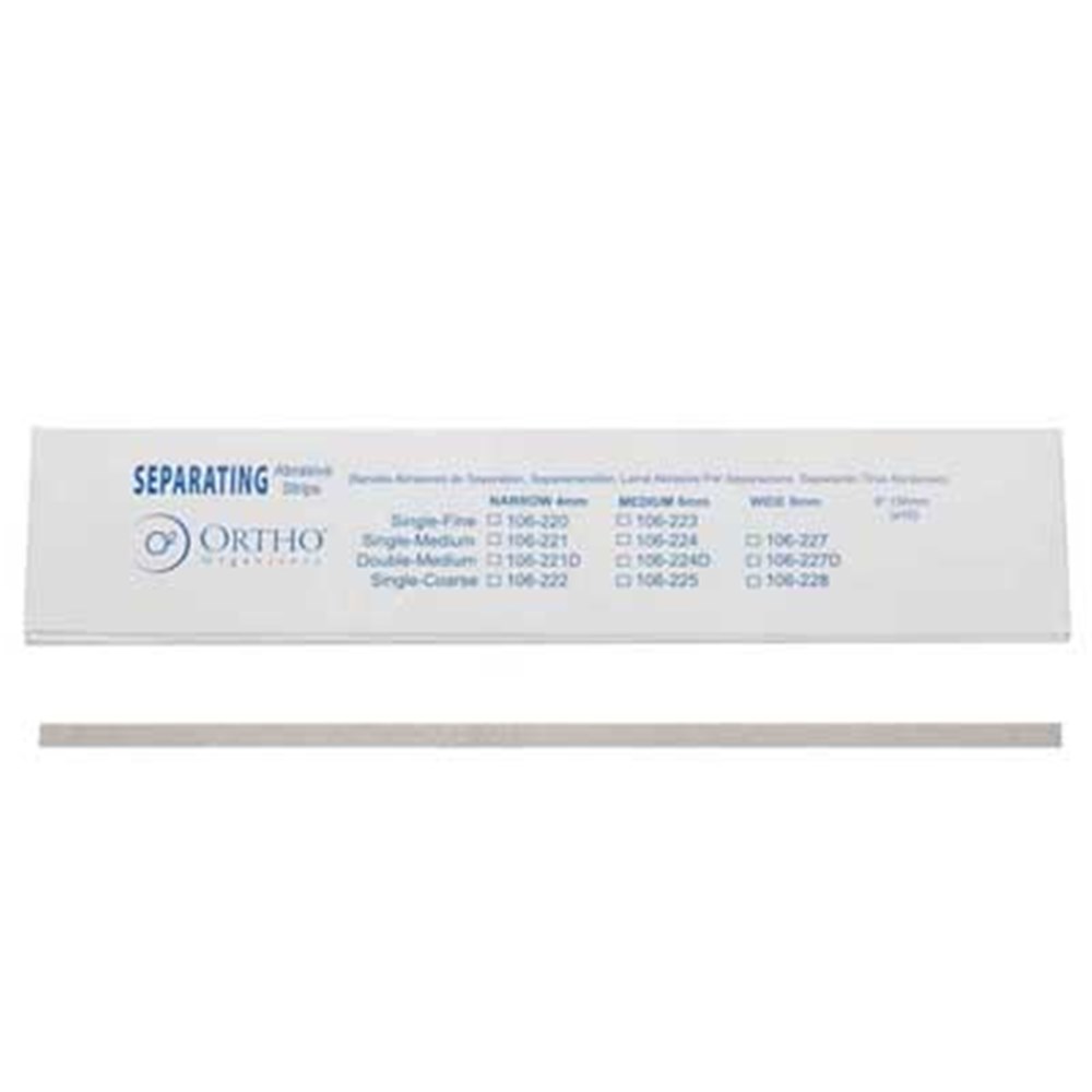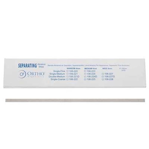 Separating abrasives strips are used to reduce and/or shape the interproximal area.  Each strip is made of durable diamond abrasive which has been electronically bonded to surgical grade steel base so strips resist stretching, breaking and corrosion.Strips are.003" thick - Coarse 8mm - Single Sided. Pack of 10.
