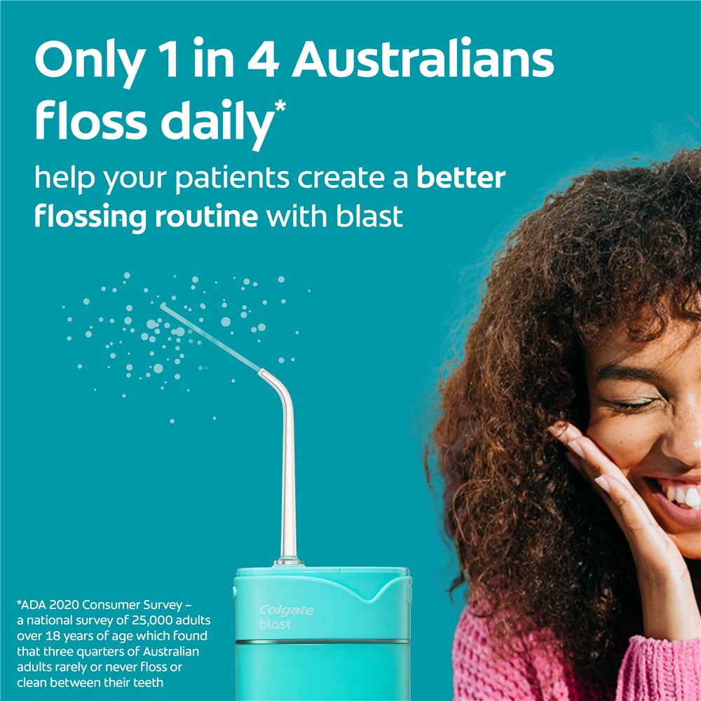 Colgate Blast Cordless Water Flosser provides better flossing* for a cleaner feeling**. It gives you the easy clean for all those tricky in-betweens in your mouth and along your gums.