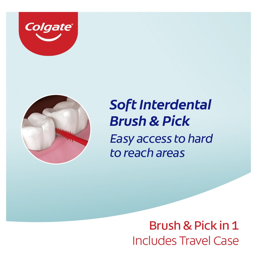 The Colgate Interdental Brush & Pick gives 2 in 1 cleaning for improved mouth health. It has soft flexible bristles which are metal free with a handy toothpick to remove food debris. They come in a 40 pack and include a travel case for hygienic storage and added convenience.