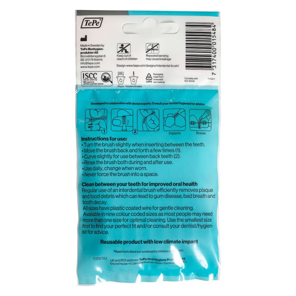An interdental brush by TePe, designed to clean the gaps between the teeth, where a regular toothbrush is unable to reach. Use daily to keep gums and teeth healthy and fresh. The interdental brush can be used for cleaning between teeth, implants, crowns, and bridges. It's also suitable for cleaning around brackets and wires during orthodontic treatment.
