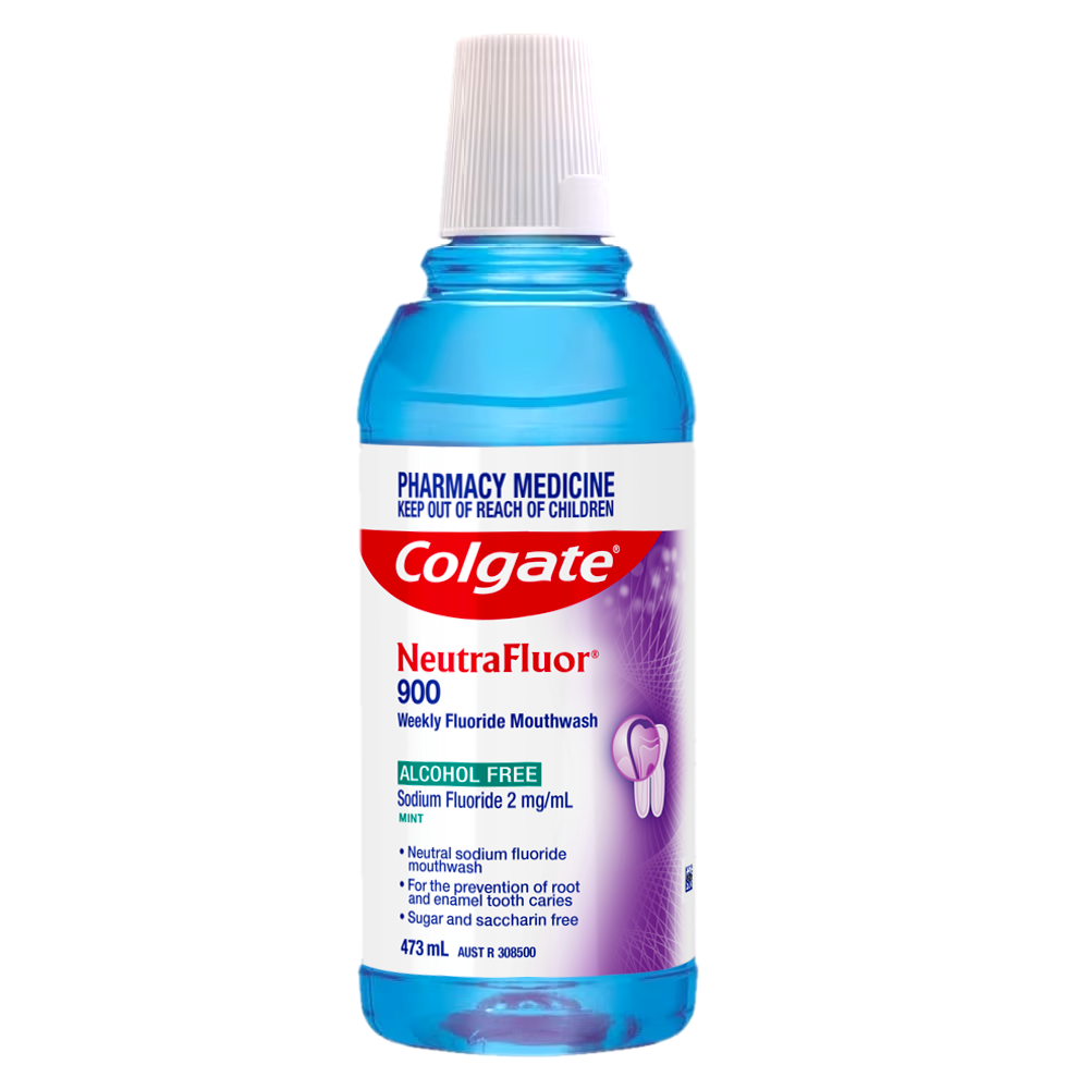 Colgate Neutrafluor 900 mouthwash (sodium fluoride 0.2% w/w - 900ppm F) is a fluoride mouth rinse intended to be used once a week. It is clinically proven for the prevention of root and enamel tooth caries. Colgate Neutrafluor 900 is 0.2% neutral sodium fluoride in a mint flavoured solution. Use weekly or as directed as a caries preventive. Topical application of sodium fluoride increases tooth resistance to acid dissolution, promotes remineralisation and inhibits the cariogenic microbial process.