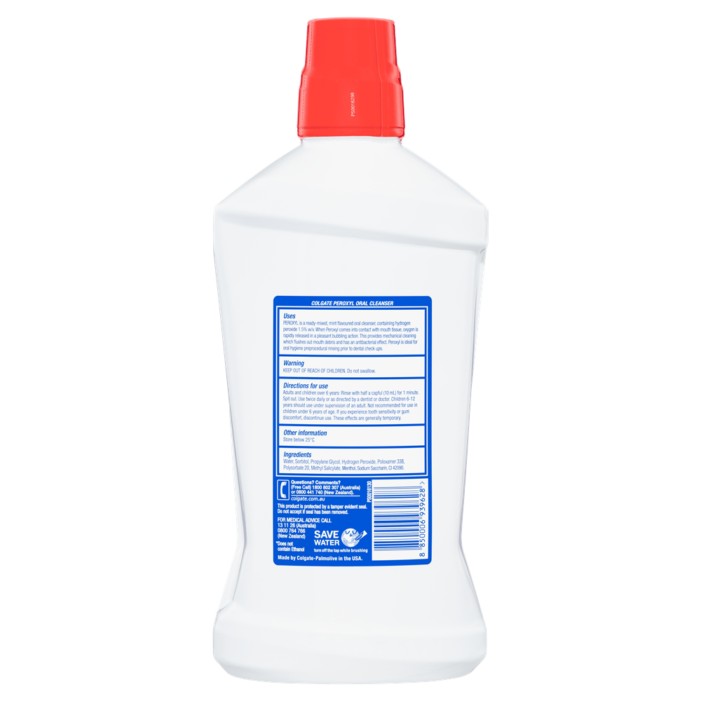 Colgate Peroxyl Oral Hygiene Mouth Rinse Mouthwash Mild Mint is a ready-mixed oral cleanser with oxygenating cleansing action. Rapid release of oxygen and non-staining. Alcohol free (does not contain ethanol). With 1.5% w/v Hydrogen Peroxide.