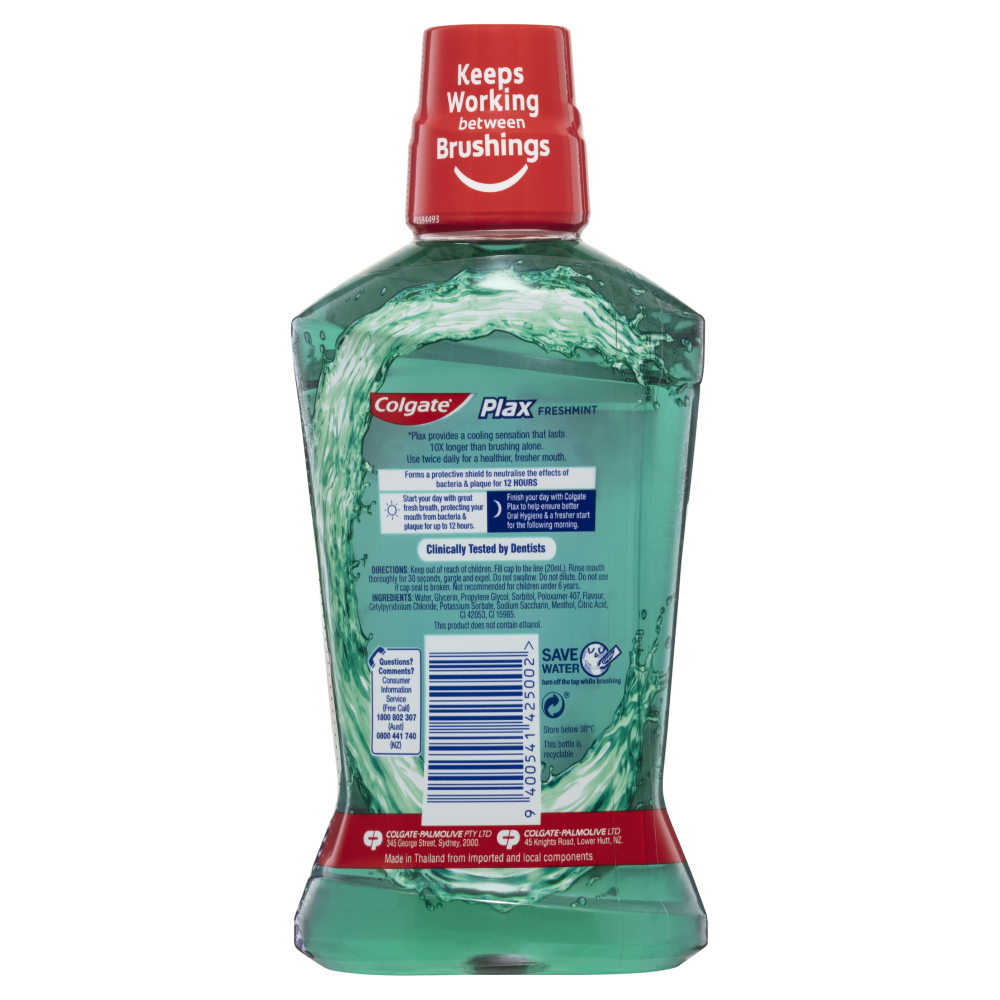 Colgate Plax Antibacterial Alcohol Free Fluoride Mouthwash Freshmint kills up to 99.9% of germs and used twice daily provides 24/7 bad breath control for long lasting freshness.
