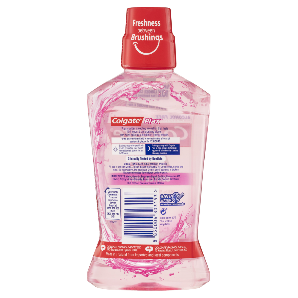 Colgate Plax Antibacterial Alcohol Free Fluoride Mouthwash Gentle Mint kills up to 99.9% of germs and used twice daily provides 24/7 bad breath control for long lasting freshness.