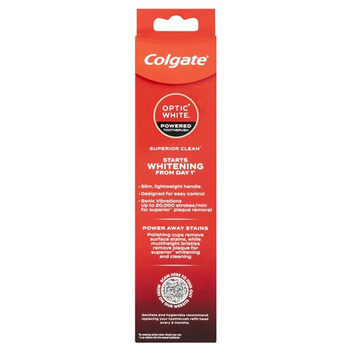 Colgate Optic White Powered Toothbrush Soft starts whitening from day 1*. It polishes the surface of your teeth, has a 2 minute timer and 2 brushing modes: regular & sensitive.