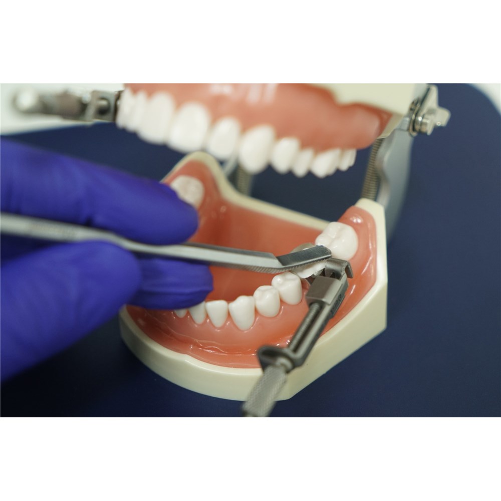 The Maestro Matrix Master features a double-sided design: one side facilitates the placement of matrix bands, while the other aids in their removal. The placement side incorporates a fork-like design with carefully positioned slots, enabling perpendicular engagement with the matrix band surface and facilitating precise force application. Additionally, it includes a knurled base that enhances grip when securing the band in the seated position during tightening. The opposite end of the Matrix Master utilises a teardrop to aid safe removal of the band.
