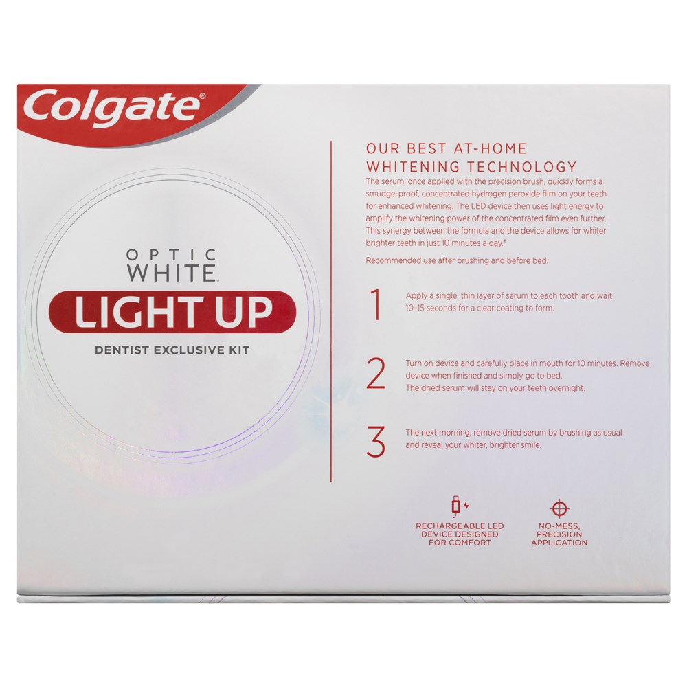 Reveal your whiter, brighter smile with Colgate® Optic White® Light-Up Dentist Exclusive Kit. A Professional, Take-Home Teeth Whitening Kit with an LED Teeth Whitening Device, Whitening Serum Pen and 6% hydrogen peroxide, for dramatically whiter teeth in 5 days*.